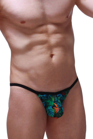 This thong features a soft nylon front pouch adorned with a striking tropical pattern . The back is designed as an ultra-minimalist T-back . It provides minimal coverage at the back, while offering a unique and colorful curve at the front.