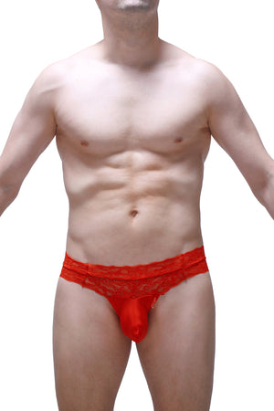 Red erotic underwear with a front pouch in fine nylon, a lace waistband, drawstrings, and thin elastics on the buttocks. A small ring allows you to tighten the strings and turn it into a Y-string.