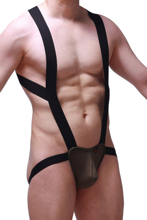 Coupe Hybride (Harnais/Jockstrap) : L'avant présente une poche jockstrap galbée en nylon vert olive, tandis que la structure complète est celle d'un body minimaliste ou d'un harnais.