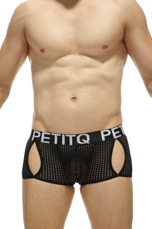 Boxer noir transparent avec trois ouvertures : sur les cotes et a l'arriere sur les fesses. Ceinture noire PetitQ. Un peu serre aux cuisses.