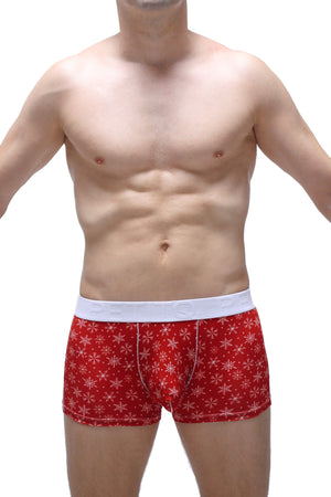 Boxer rouge avec imprimé de flocons de neige. Poche avant sans couture. Coutures blanches assorties à la ceinture. Taille un peu grand.