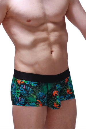 Ce boxer court est orné d'un magnifique motif tropical (composé de feuilles vertes luxuriantes et de fleurs de strelitzia orange) sur fond noir, pour un look résolument estival et basse-taille (low-rise).