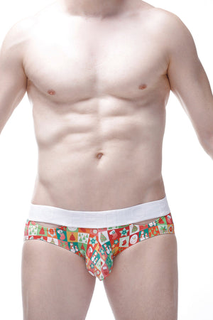Un jockstrap pour Noël ? On dit oui ! Ceinture blanche, Imprimé de petits bonhommes de neige et sapins comme un paquet cadeau.